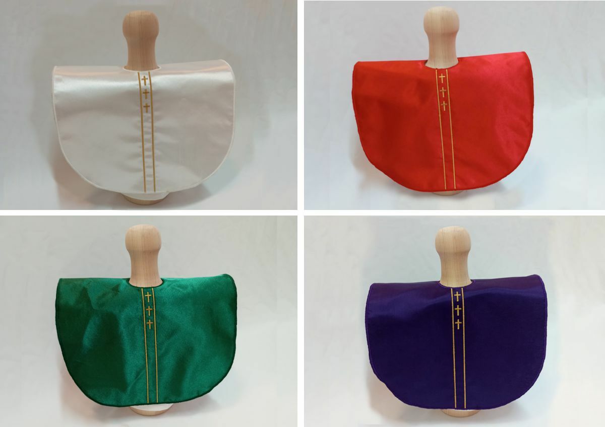 Ornáty jsou ušité v liturgických barvách a a lze je obléci na dodávanou figurku. (figurku lte objednat zde) Pod ornát se obléká alba (albu na figurku kněze lze objednat zde).