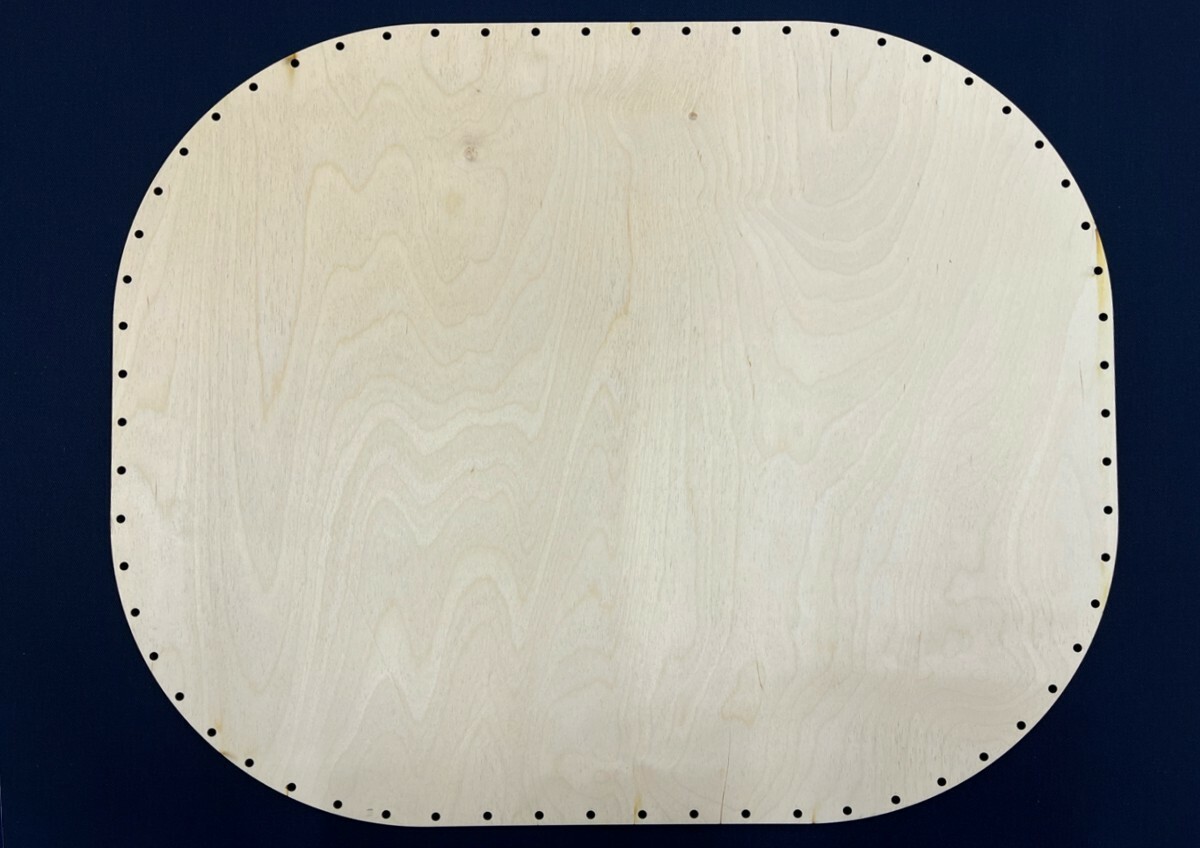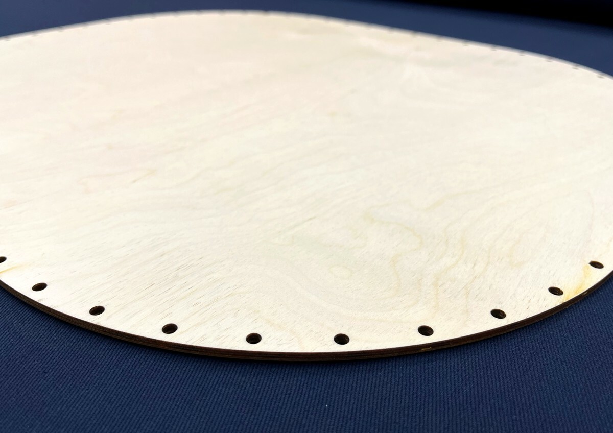 Dno ve tvaru OVÁLU (60 x 50 cm) pro výrobu košíku. Toto konkrétní dno je na pravý, neoplétaný pedig tloušťky do 4,5 mm nebo na papírové ruličky. Dírky mají průměr 5mm a vzdálenost mezi nimi cca 3 cm. Tvar je vyřezán laserem z překližky (tloušťka materiálu je 4 mm)