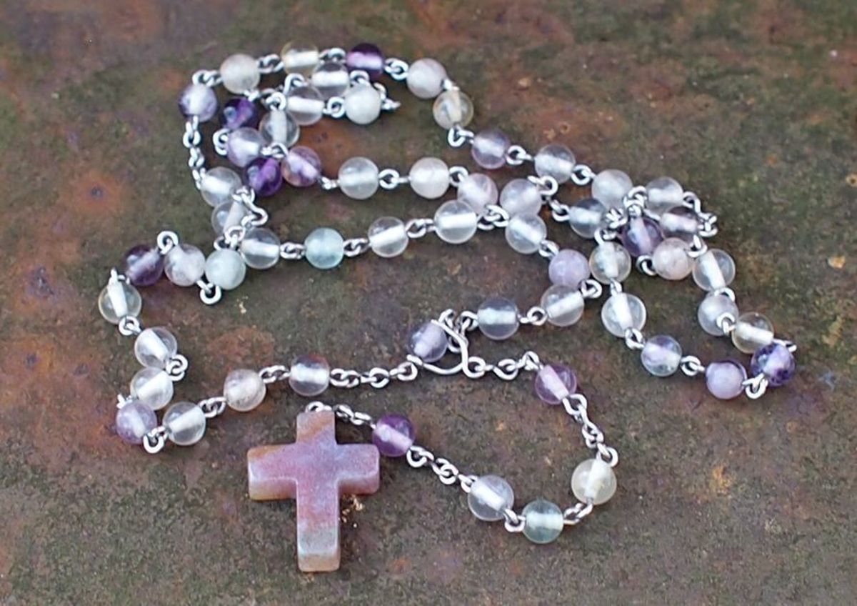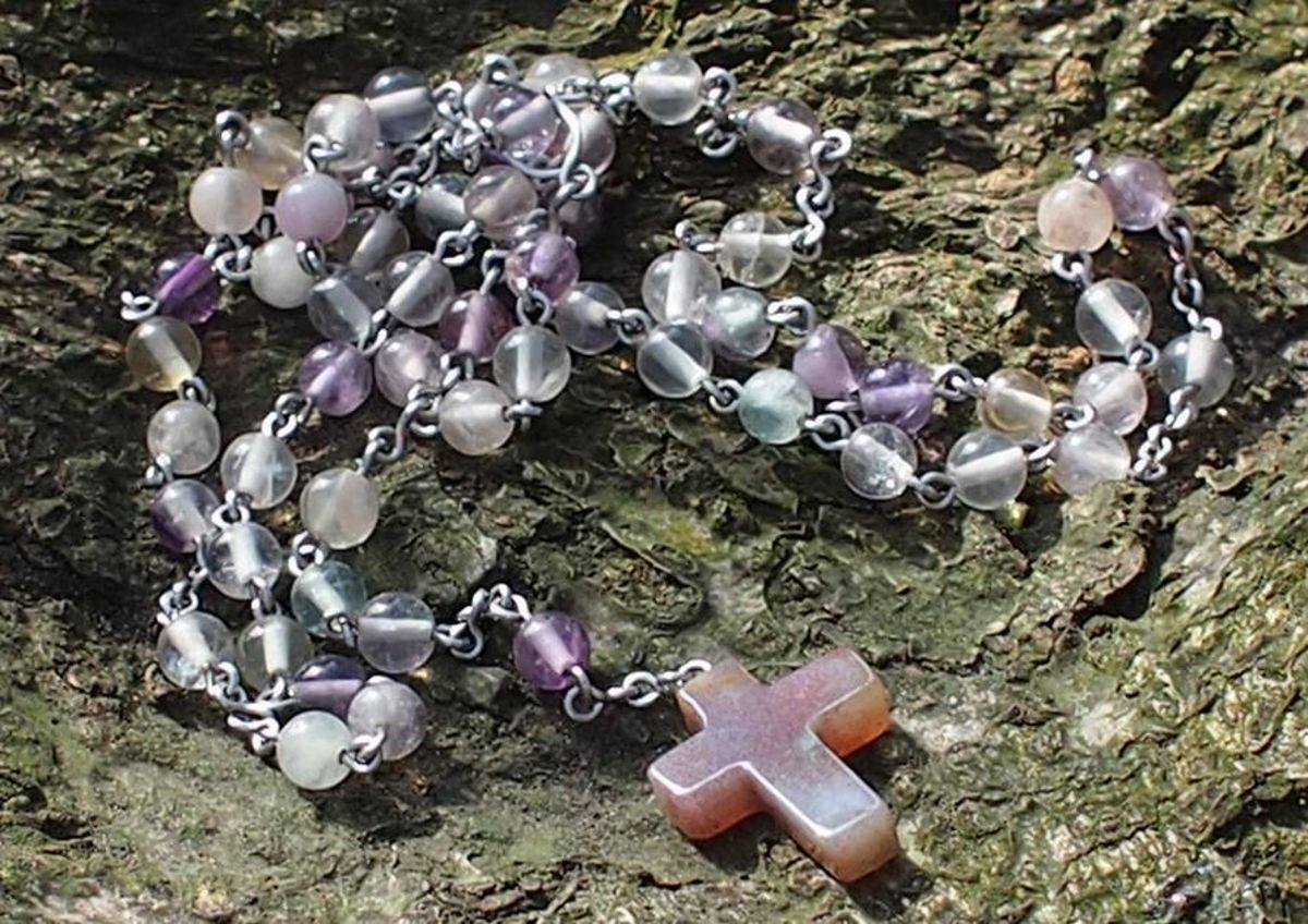 Růženec z fluoritu a chirurgické oceli vyrobený v naší chráněné dílně.