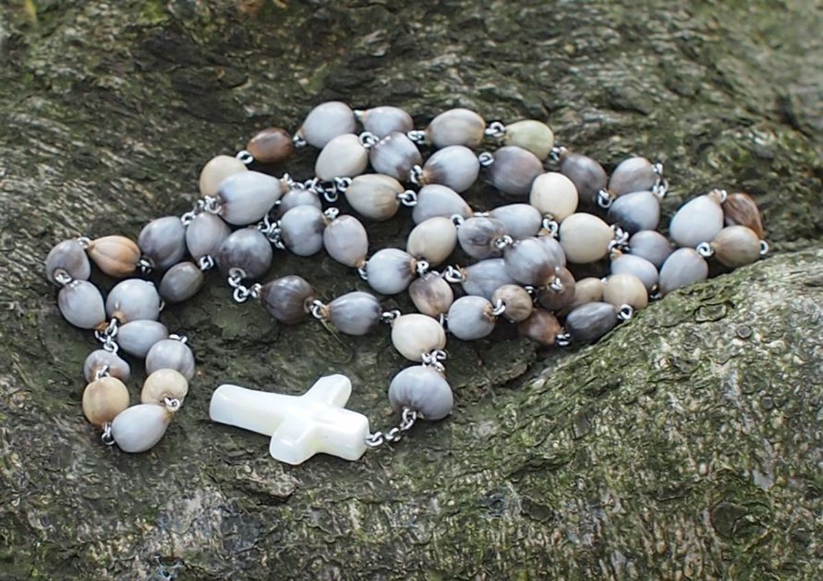 Rúženec z Jobových slz (plody rostliny slzovky), plodům se říká také slzy Panny Marie, nebo Ježíšovy slzy. Křížek je z perleti. Jinak jsou všechny kovové části růžence z chirurgické oceli. Růženec je vyroben v naší chráněné dílně.