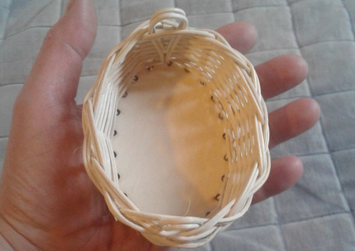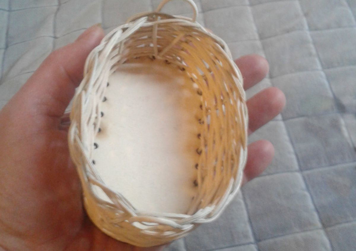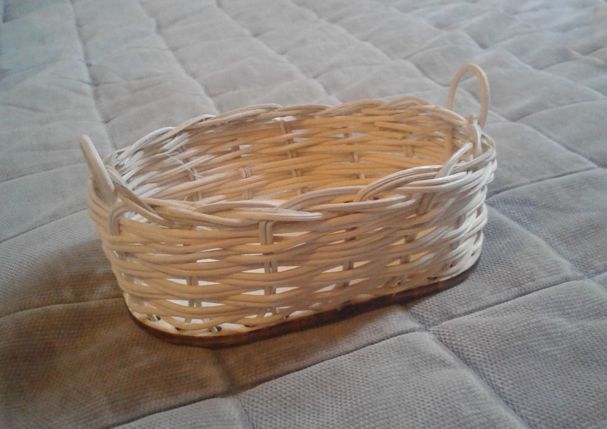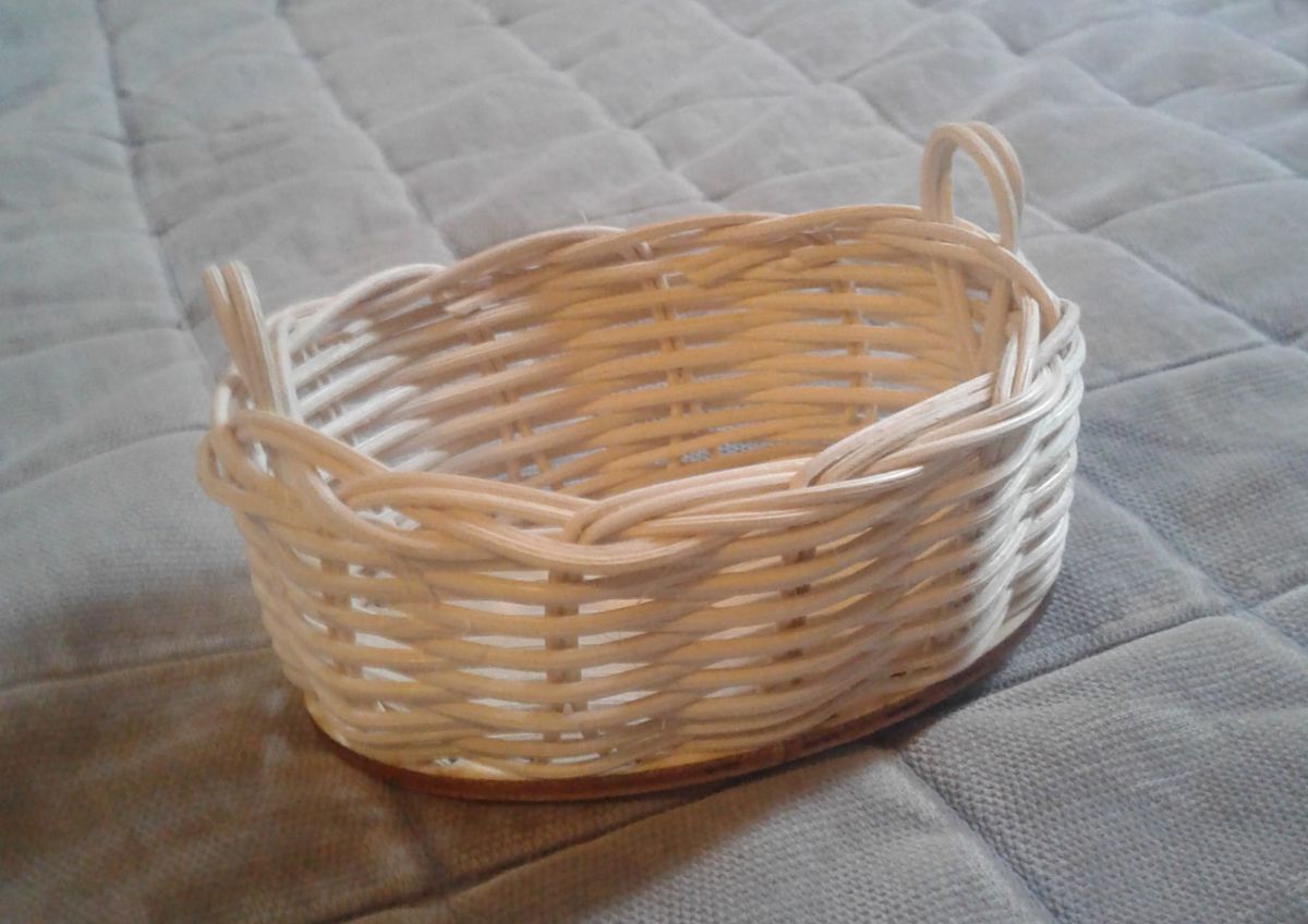 Dno je z překližky, menší má tvar elipsy 9x6cm, větší koš má dno ovál 10x6cm. Oba koše jsou vysoké cca 4 cm a směrem nahoru se trochu rozšiřují.