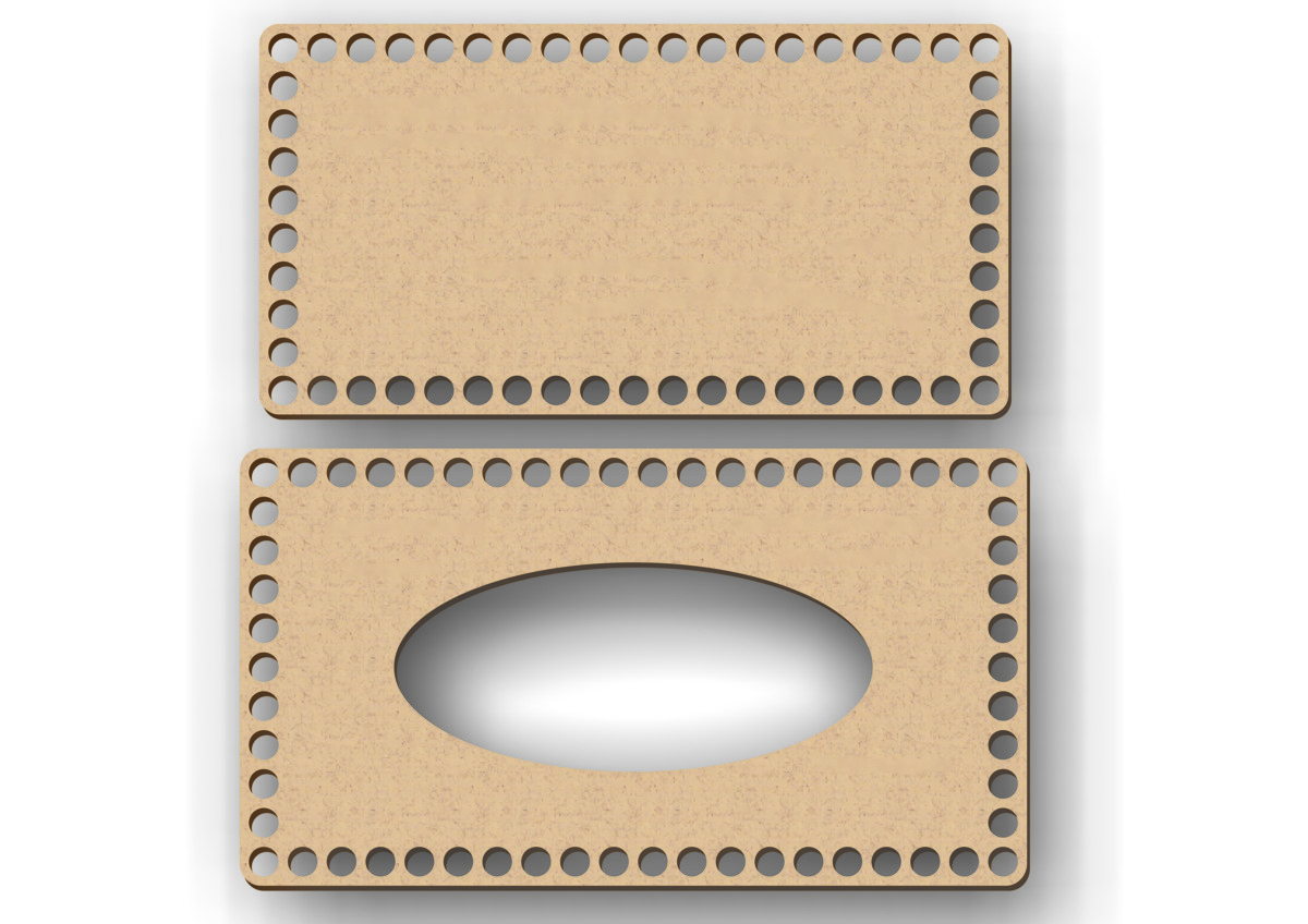 Sada - Dno a víko na háčkovanou krabičku na papírové kapesníky. Vyřezáno laserem z překližky (tloušťka materiálu je 3-4 mm), průměr dírky je 10 mm. Mezery mezi dírkami jsou 3 mm, takže středová vzdálenost dírek je 13 mm.