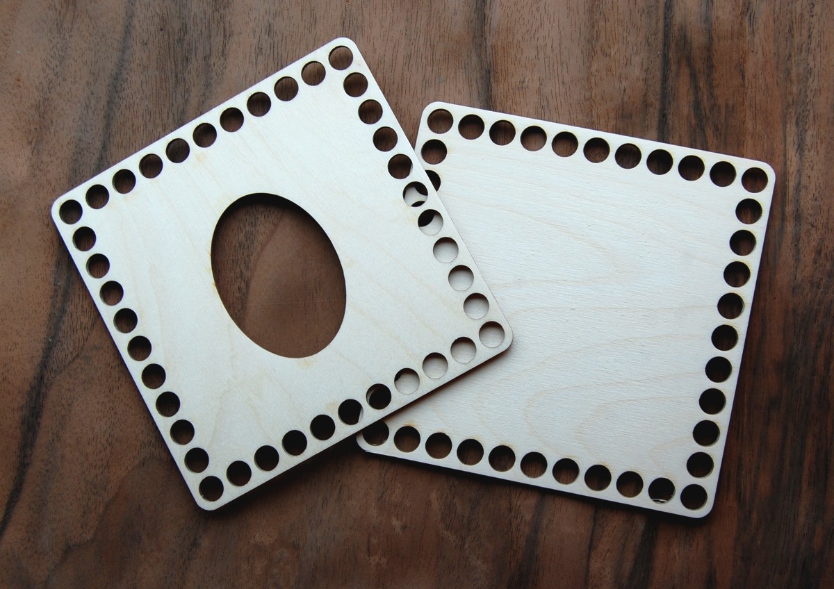 Sada - Dno a víko na háčkovanou krabičku na papírové kapesníky. Vyřezáno laserem z překližky (tloušťka materiálu je 3-4 mm), průměr dírky je 10 mm. Mezery mezi dírkami jsou 3 mm, takže středová vzdálenost dírek je 13 mm.
