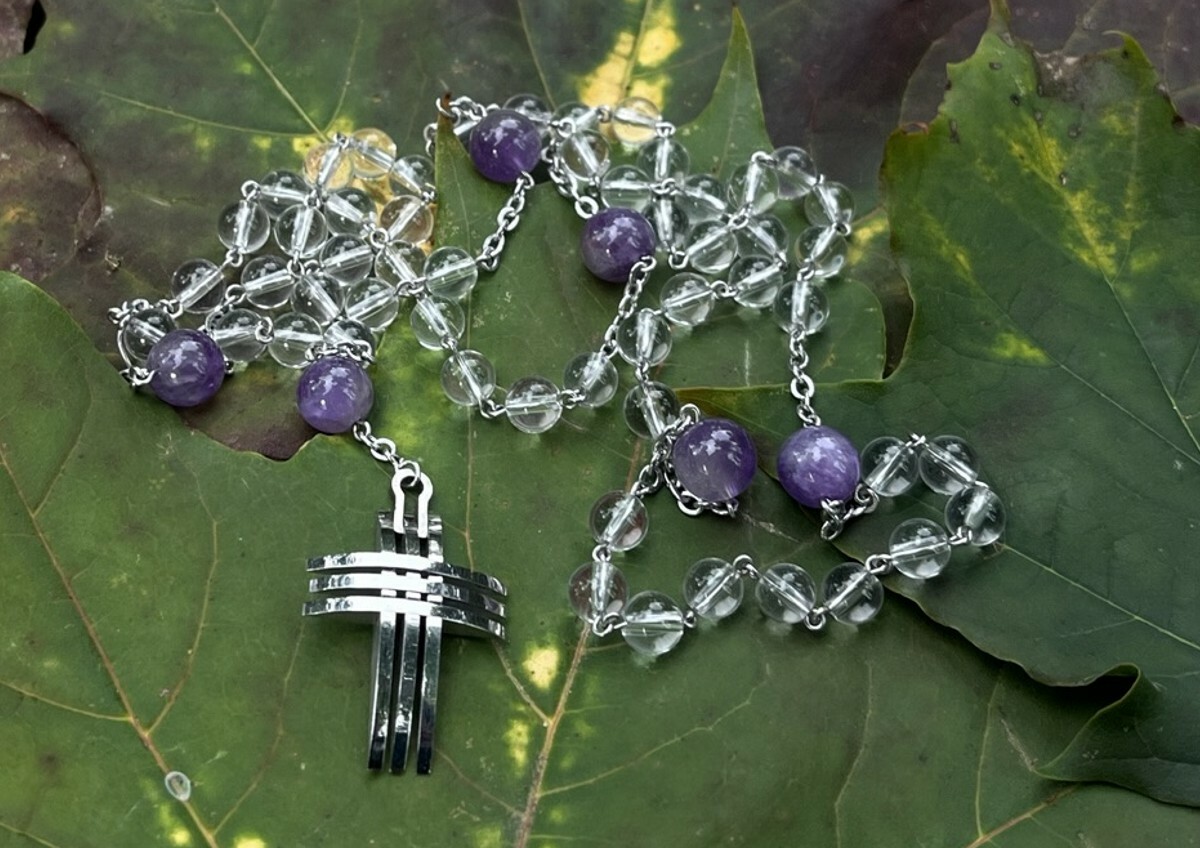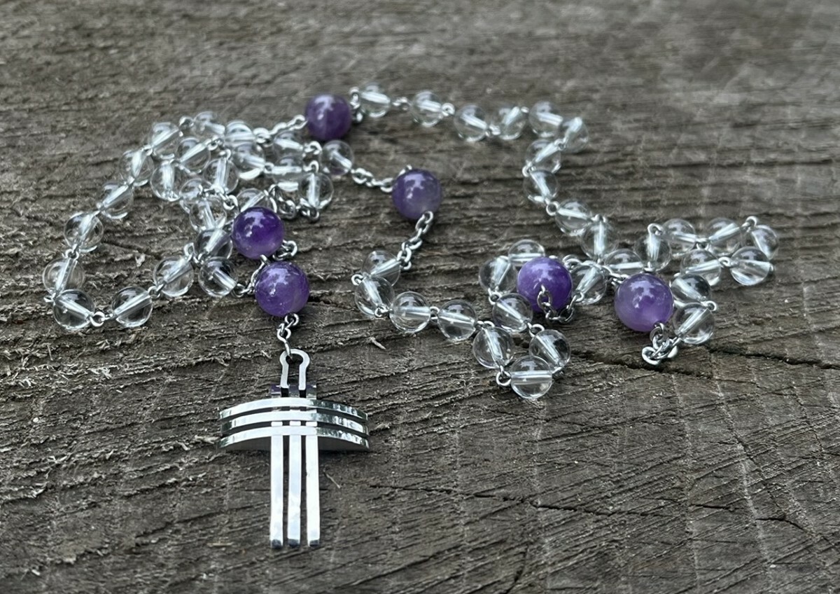 Růženec z křišťálu, ametystu a chirurgické oceli vyroben v naší chráněné dílně.