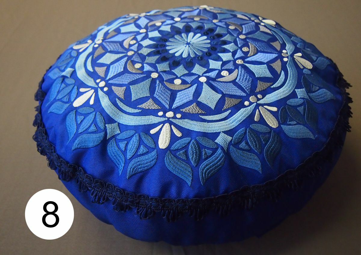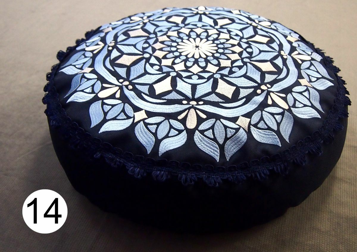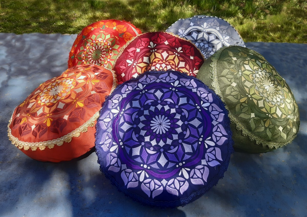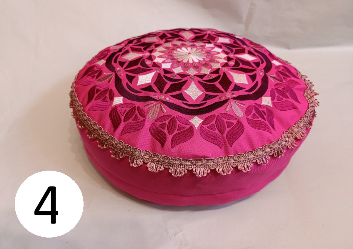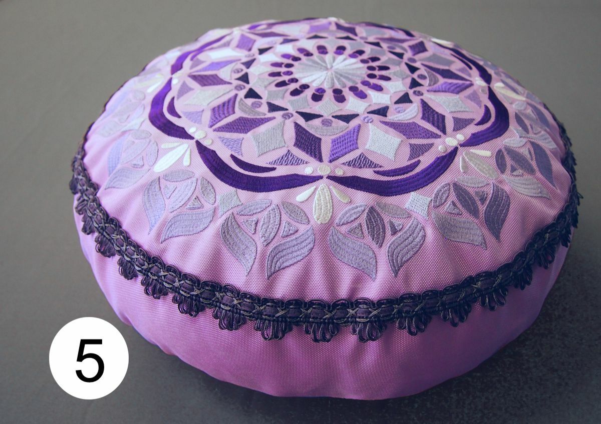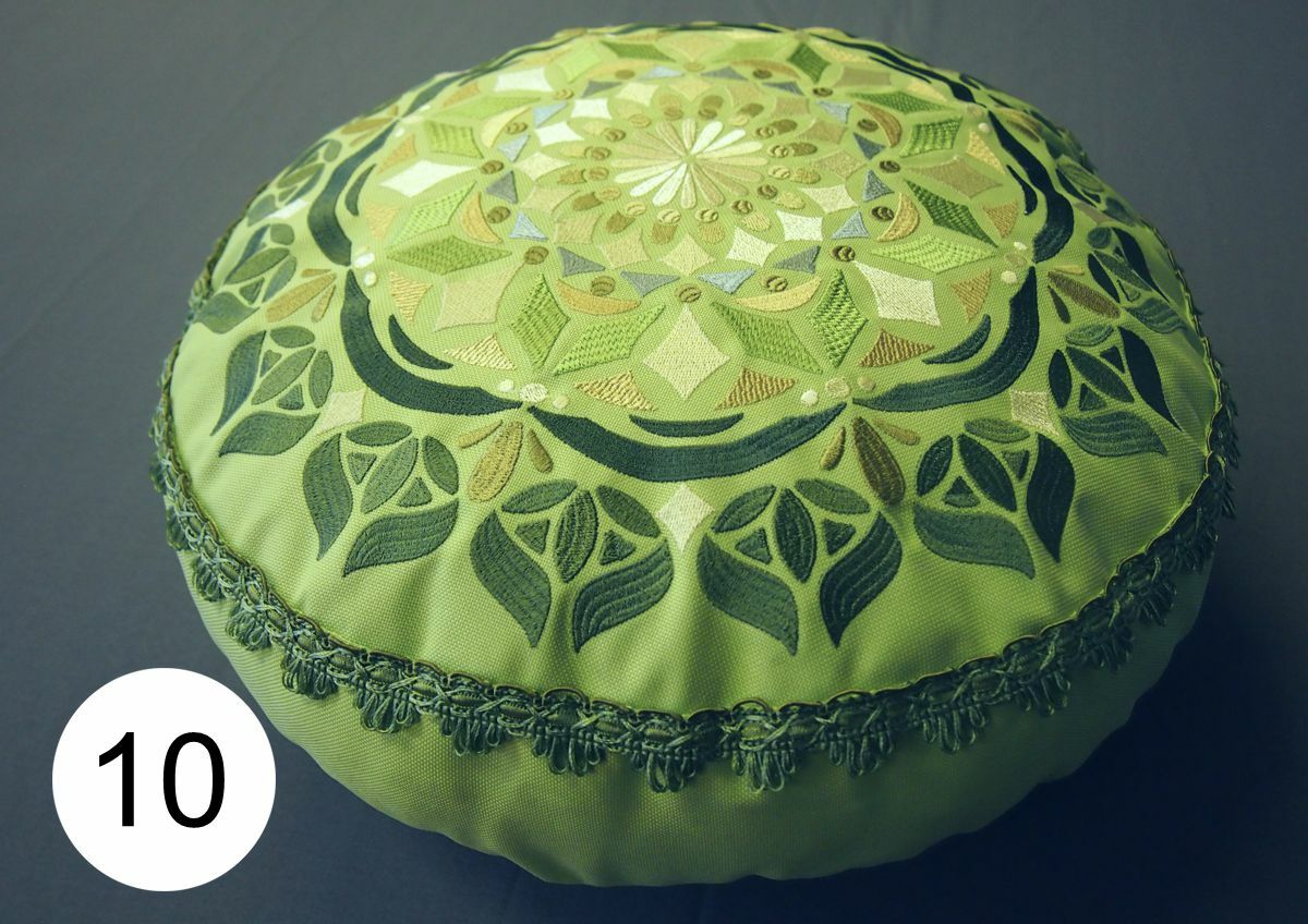 Polštářky pro ideální sezení na zemi (uvnitř i venku), ovšem všechny zazáří i v interiéru. Jsou ušity z velmi pevné polyesterové látky, která má z rubové části zátěr proti vlhkosti a chladu od země. Je třeba chránit před deštěm, horní strana polštářů je prodyšná - barva mechová; pistáciová; skořicová; fialová; světle fialová (lila); černá.
