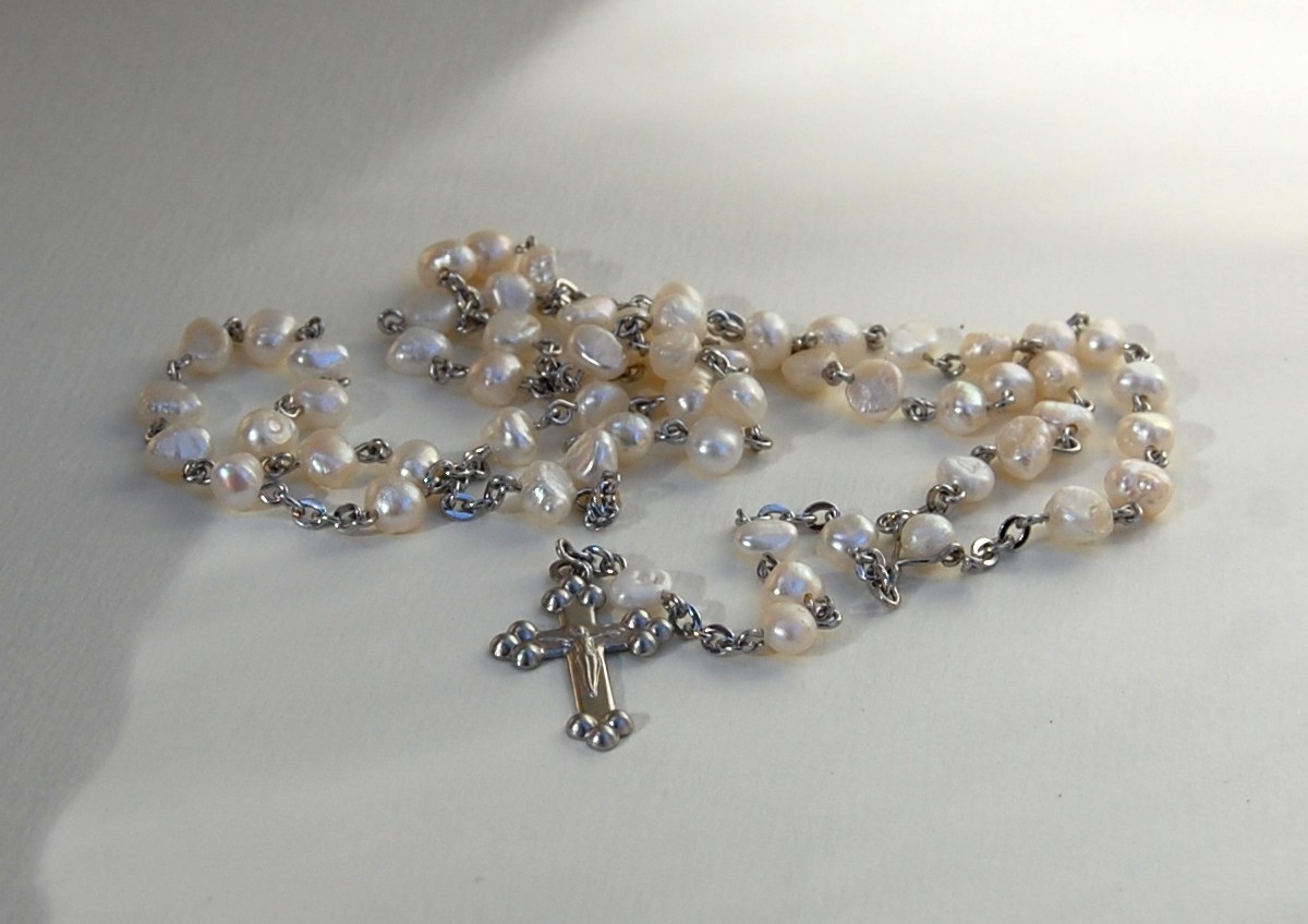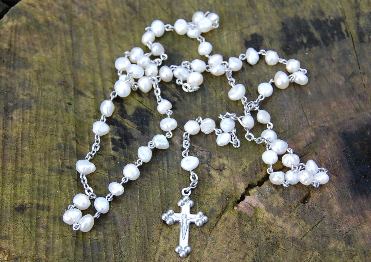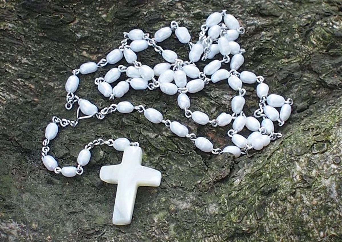 Panensky čistý a do ruky velmi příjemný růženec z bílých říčních perel a chirurgické oceli, památka na celý život. Růženec je vyroben v naší chráněné dílně.