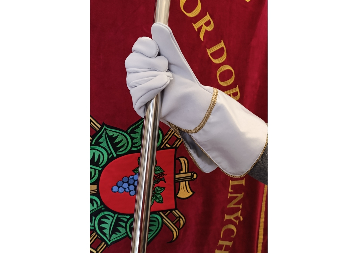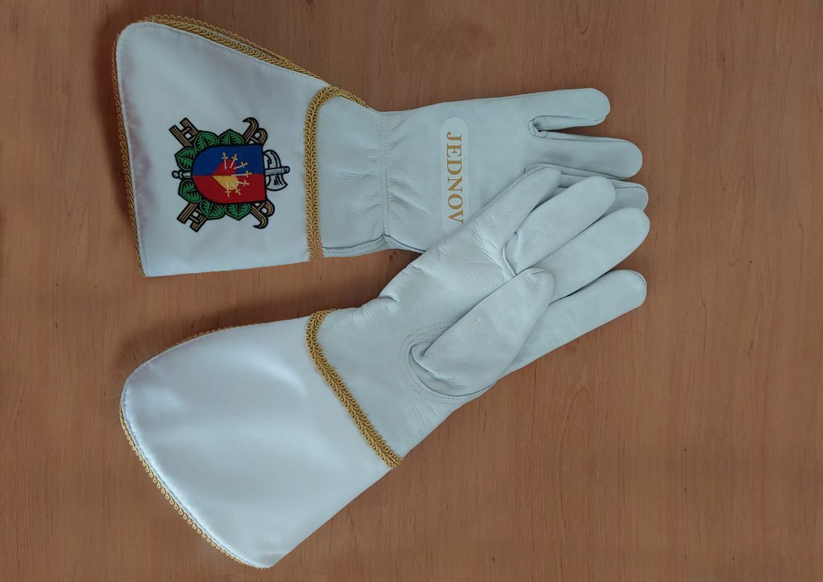 Kožené rukavice se saténovou manžetou s ozdobným lemováním a vyšitým znakem konkrétního sboru SDH