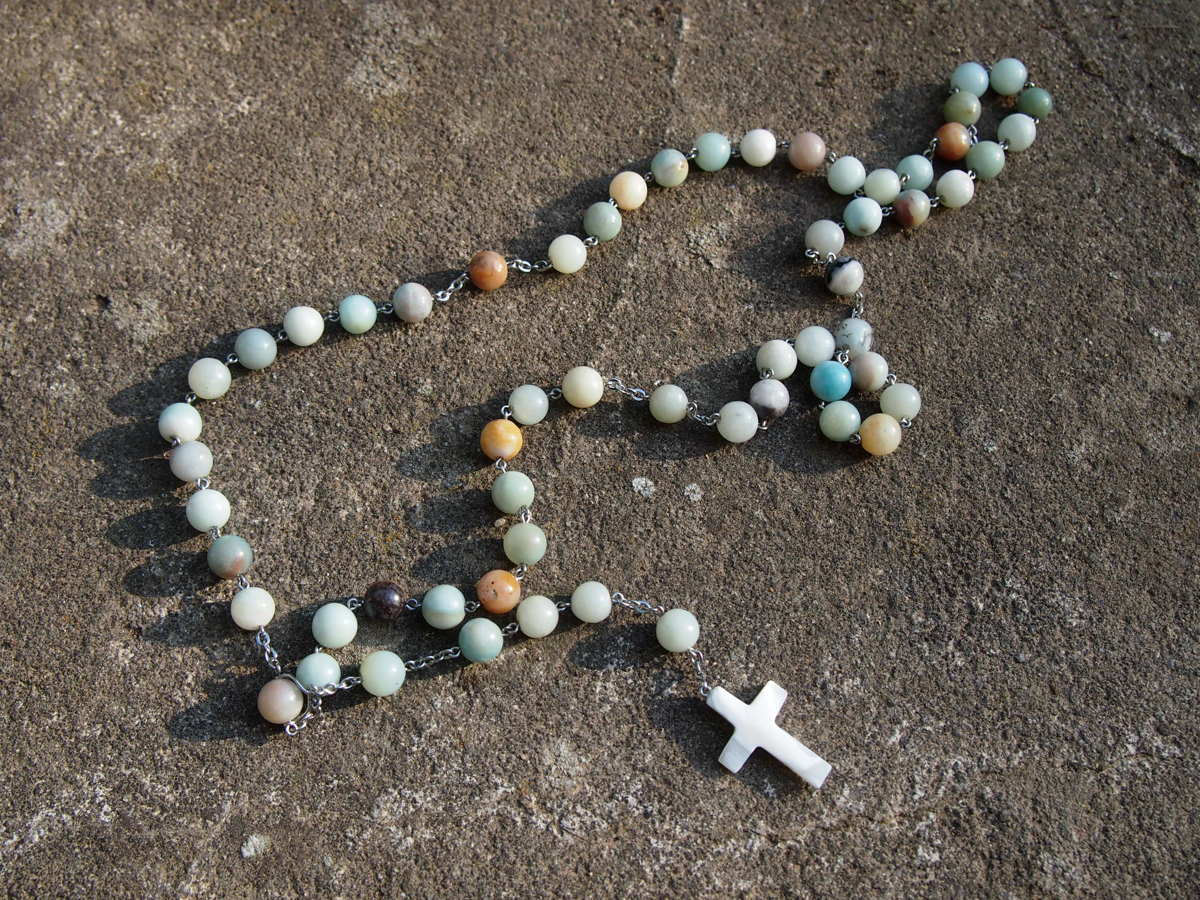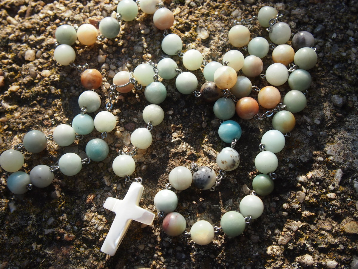 Růženec z amazonitu a chirurgické oceli vyrobený v naší chráněné dílně.
