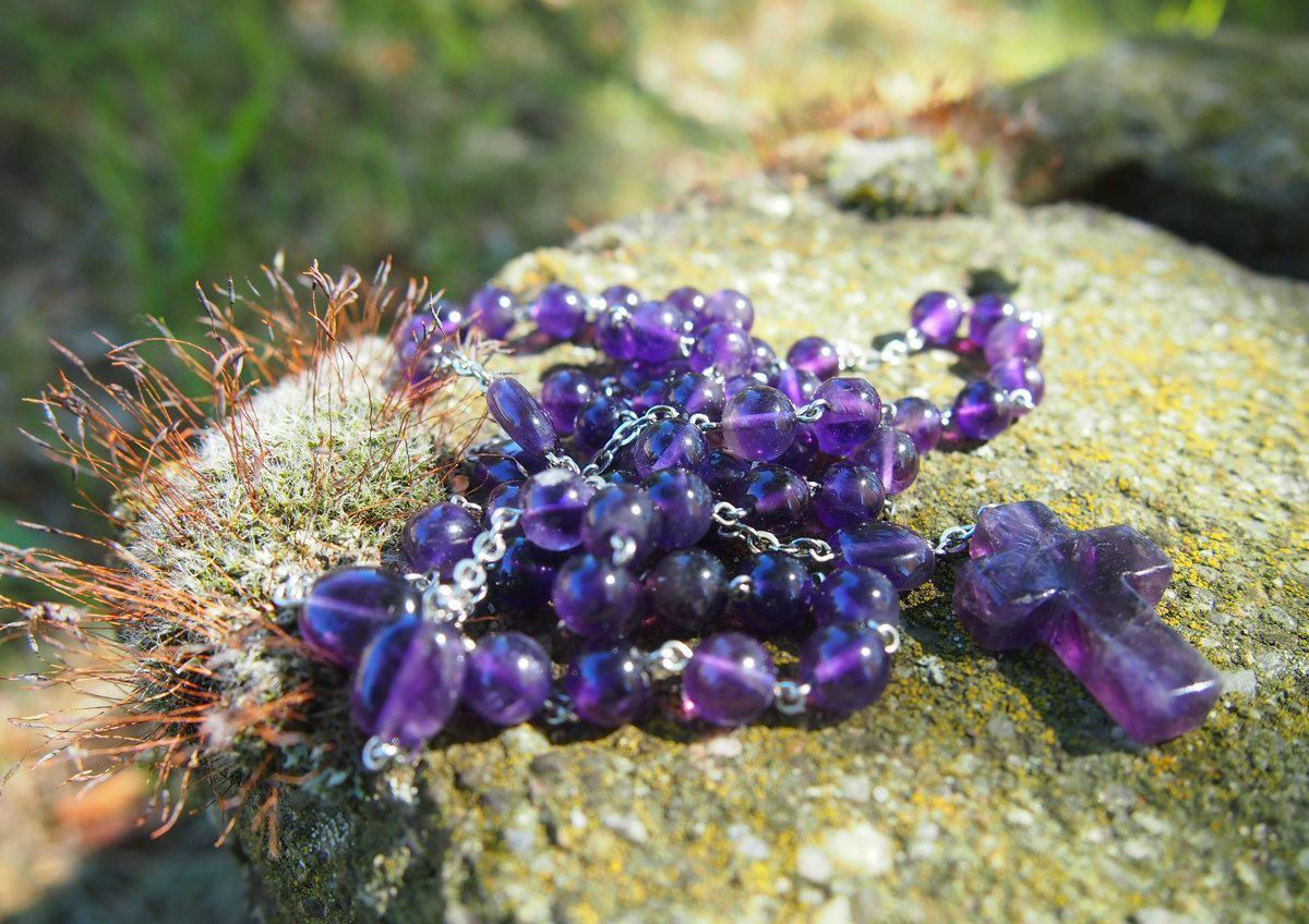 Růženec z kamene ametyst a chirurgické oceli vyrobený v naší chráněné dílně.