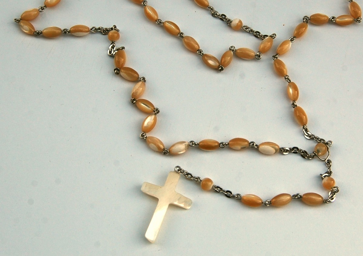 Růženec z přírodního materiálu - béžové perleti. Růženec je uketlován z perletě tvaru rýže 7x4 mm a kuliček velikosti 6mm