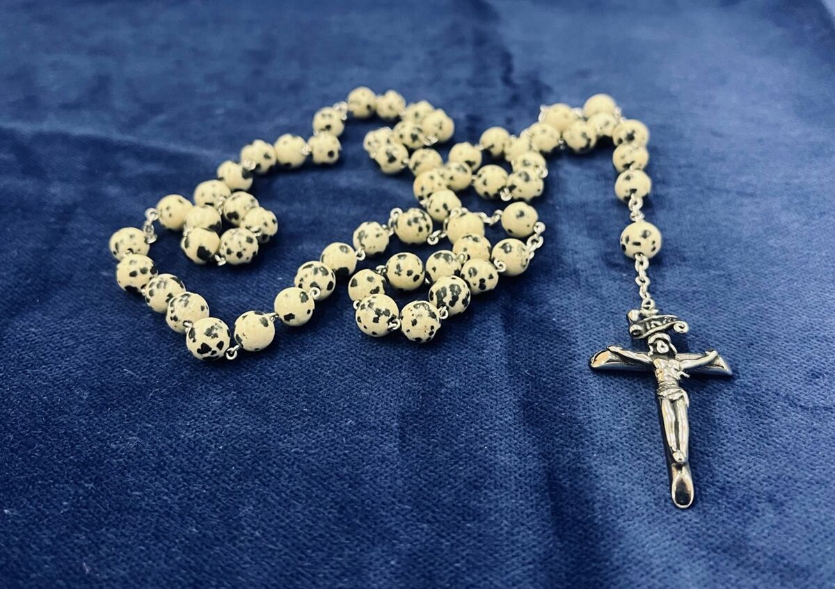 Růženec z nádherného jaspisu a chirurgické oceli vyrobený v naší chráněné dílně. Barva bílá s černými znaky, proto přízvisko dalmatin.