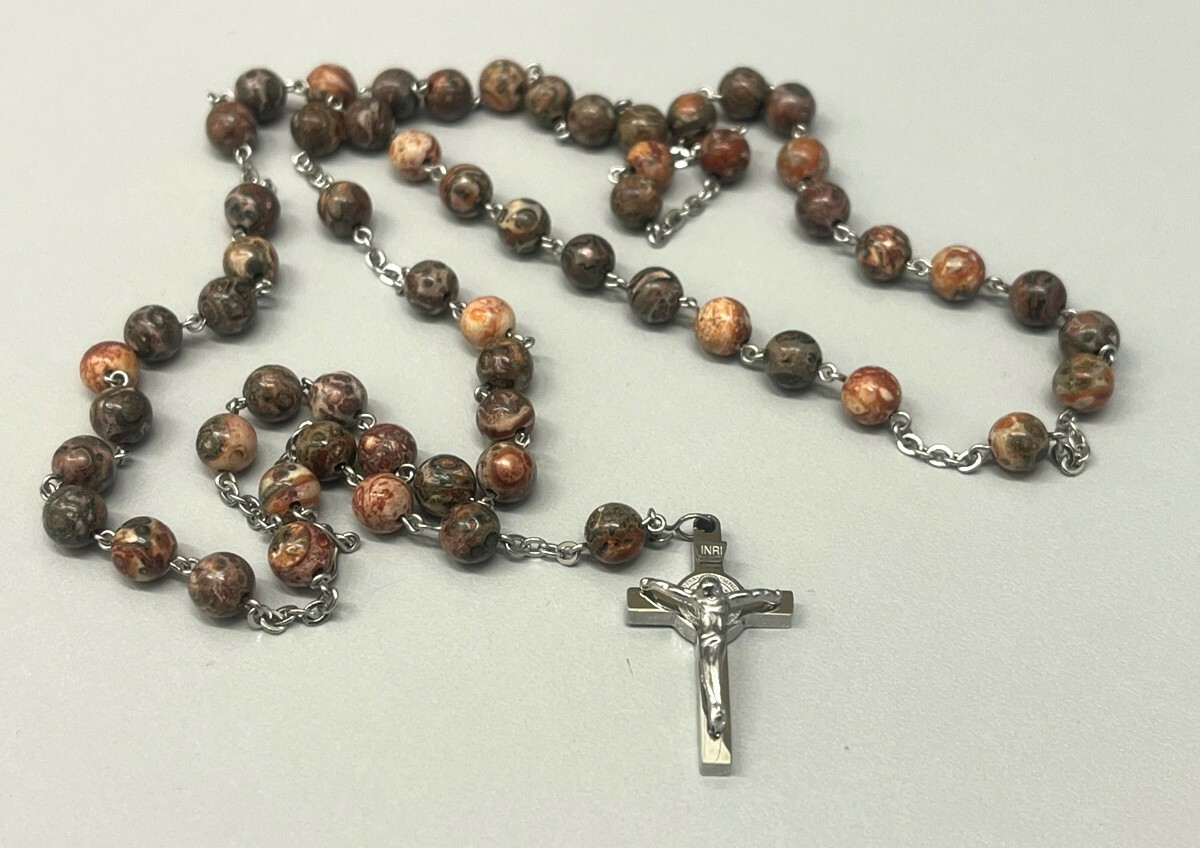 Růženec z nádherného leopardího jaspisu a chirurgické oceli vyrobený v naší chráněné dílně. Barva přechází z šedé přes hnědou až do červené.