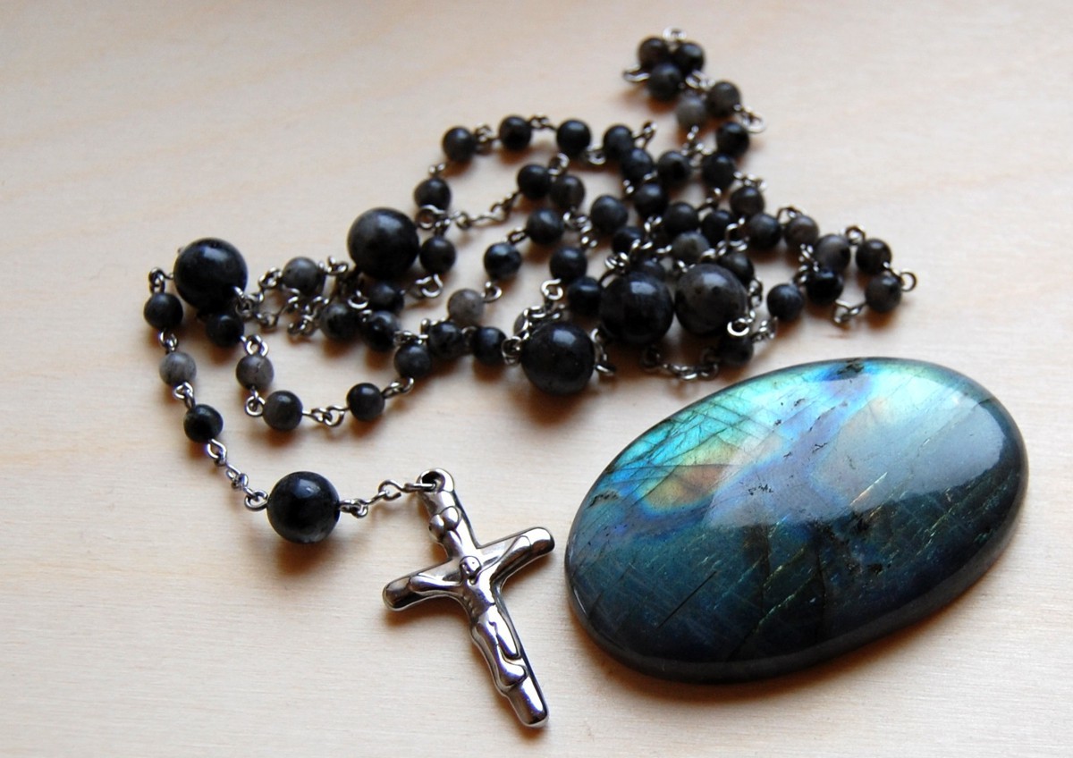 Růženec z norského labradoritu a chirurgické oceli vyrobený v naší chráněné dílně.