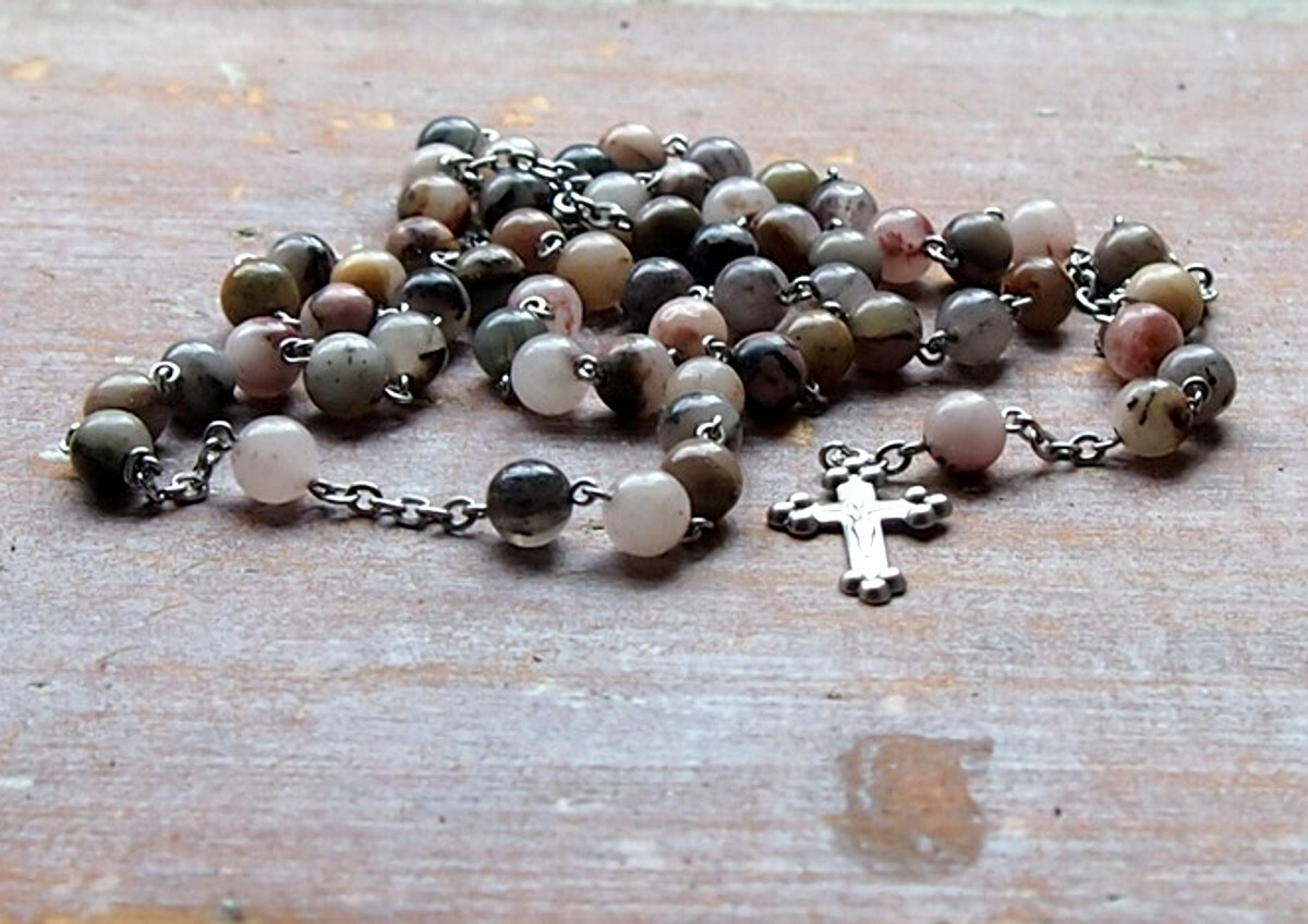 růženec je masivní, je na něm dobře vidět kresba a struktura kamene. Jde nosit na krku, obvod růžence je cca 65 cm (lze snadno přetáhnout přes hlavu). Průměr korálků je 8 mm. Tato varianta je vhodná i pro člověka s horší citlivostí v prstech.