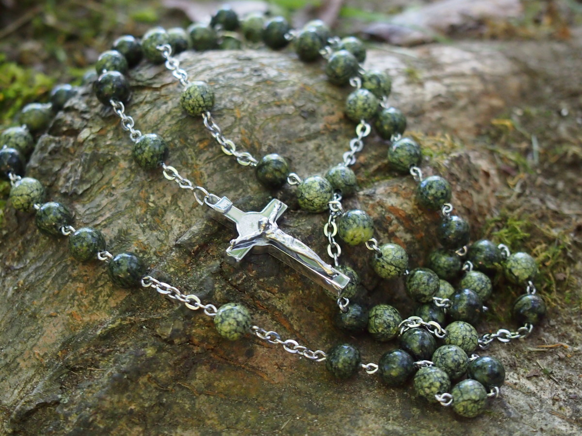 Růženec z ruského serpentinitu a chirurgické oceli vyrobený v naší chráněné dílně.