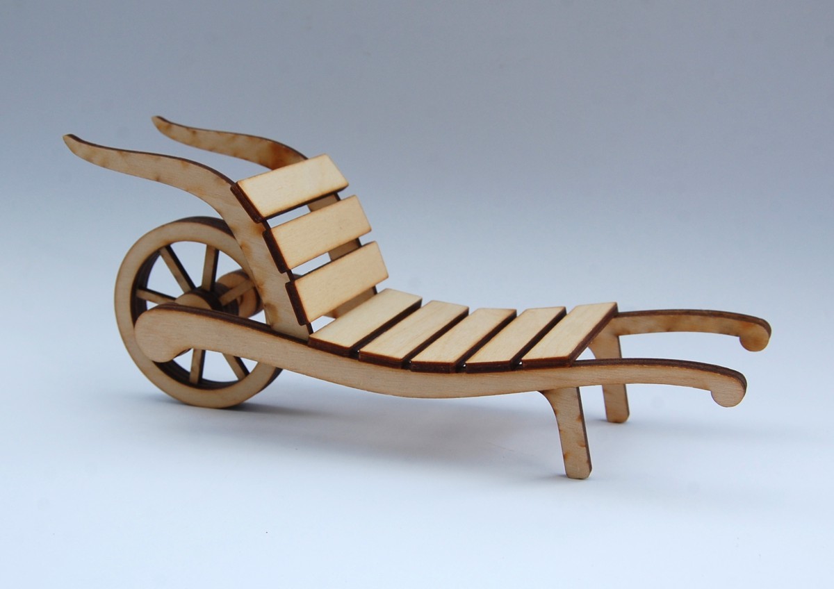 Trakař je laserem vyřezaný z bukové překližky, celodřevěný, bez kovových částí.